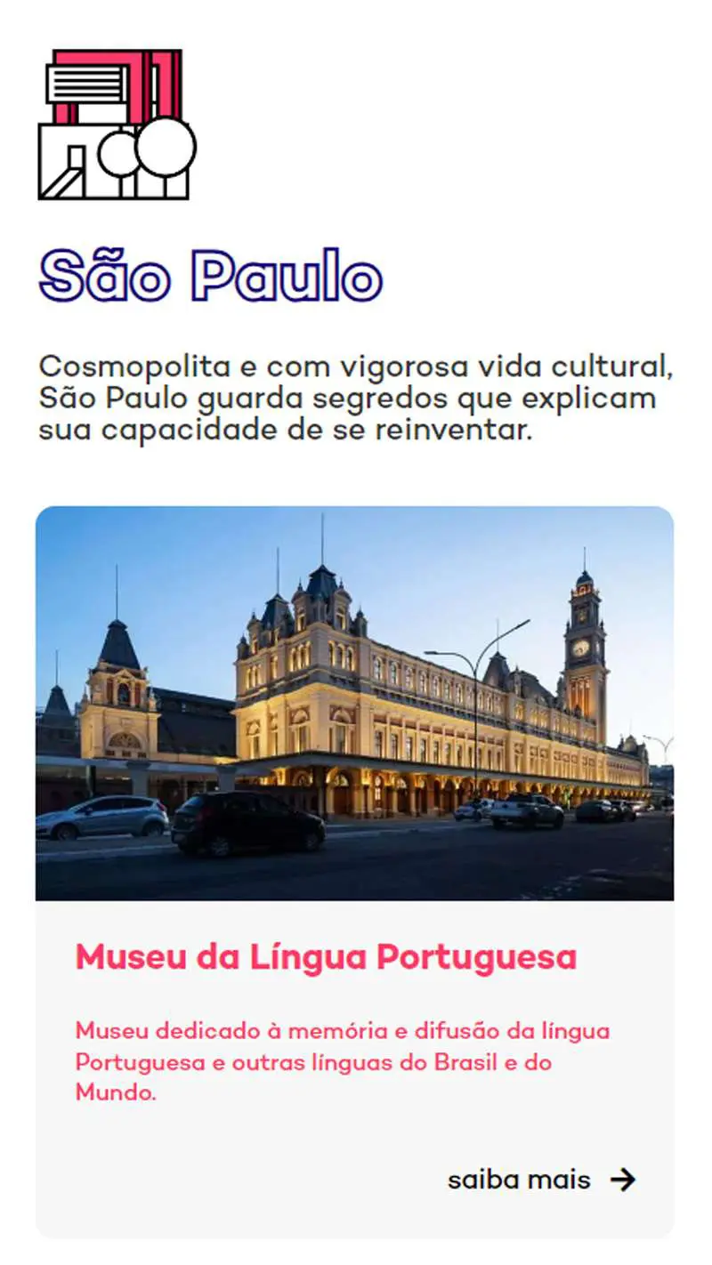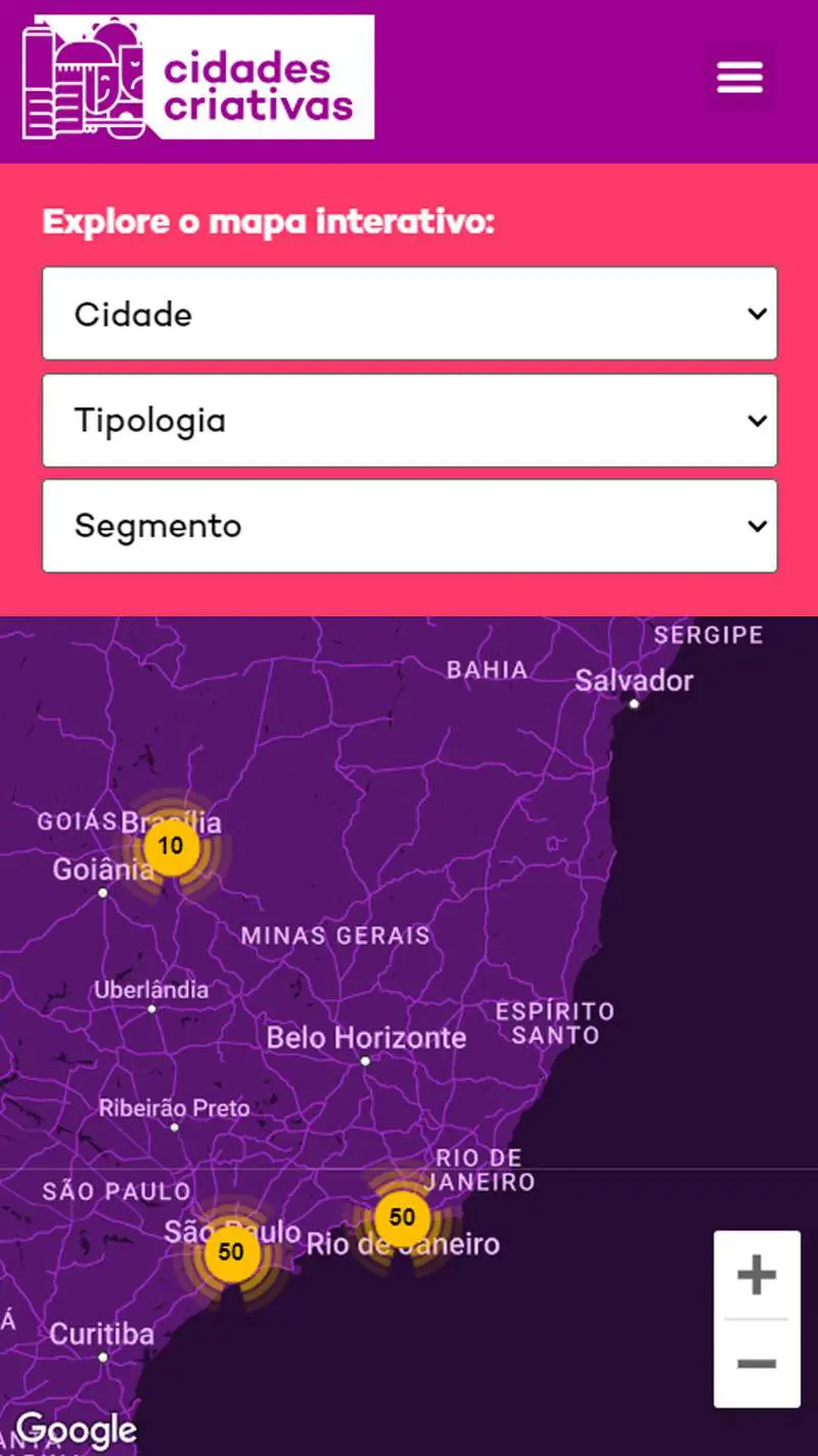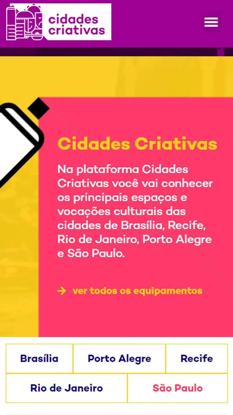 O Cidades Criativas é um projeto que se propõe a mapear a oferta de práticas e equipamentos culturais de cinco grandes capitais brasileiras: São Paulo, Rio de Janeiro, Brasília, Recife e Porto Alegre. A Webinhood foi encarregada de dar cara ao projeto e desenvolver o site que abrigaria esse mapeamento, de forma que esse grande volume de informação ficasse ao alcance do público de maneira interativa e prática.