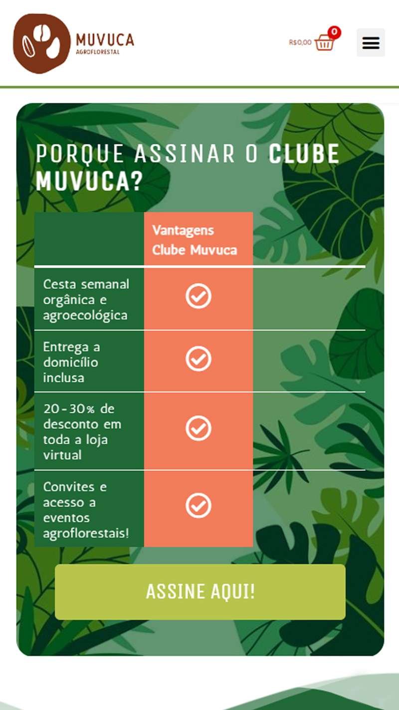 Para atender às necessidades da Muvuca, desenvolvemos uma arquitetura da informação que facilita a navegação e a seleção das cestas de acordo com as preferências dos assinantes, implementamos um e-commerce completo, incluindo um sistema de clube de assinatura que permite aos clientes receberem regularmente suas cestas orgânicas, e criamos um sistema de cupons vinculado aos diferentes tipos de assinatura, oferecendo descontos específicos para cada nível de assinatura, além de uma área de membros com benefícios exclusivos.
