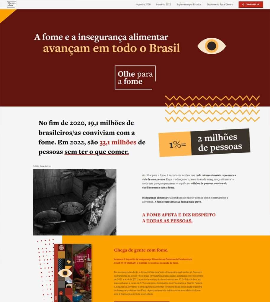 Olhe para a Fome é uma pesquisa realizada pela Rede PENSSAN abordando o tema do retorno dos índices de insegurança alimentar e fome no Brasil. Fomos chamados para transformar o layout estático da pesquisa em uma experiência interativa envolvente, aprimorando a acessibilidade e a compreensão dos dados apresentados sobre essa realidade no Brasil.