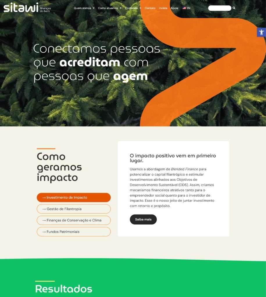 A Sitawi, uma Organização Social de Interesse Público (OSIP), desempenha um papel fundamental na conexão entre investidores e empreendedores, buscando gerar impacto socioambiental positivo. O projeto de atualização do site foi motivado pela atualização da identidade visual da empresa e para melhorar a experiência do usuário, uma vez que o site anterior apresentava um grande volume de conteúdo com pouca organização, dificultando a navegação e a compreensão das informações disponíveis.